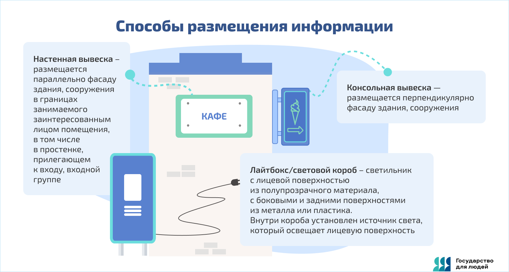 Объекты для размещения информации должны соответствовать требованиям размещения на фасаде здания или в границах занимаемого помещения. Важно учитывать количество элементов и их габариты, цветовое решение, стилистическое решение, шрифтовую композицию.