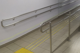 Кнопка вызова персонала для оказания помощи инвалидам всех категорий расположена с правой стороны от двери главного входа в начале подъема пандуса на высоте 1 метр.