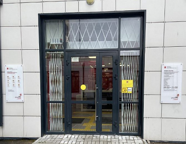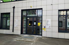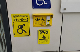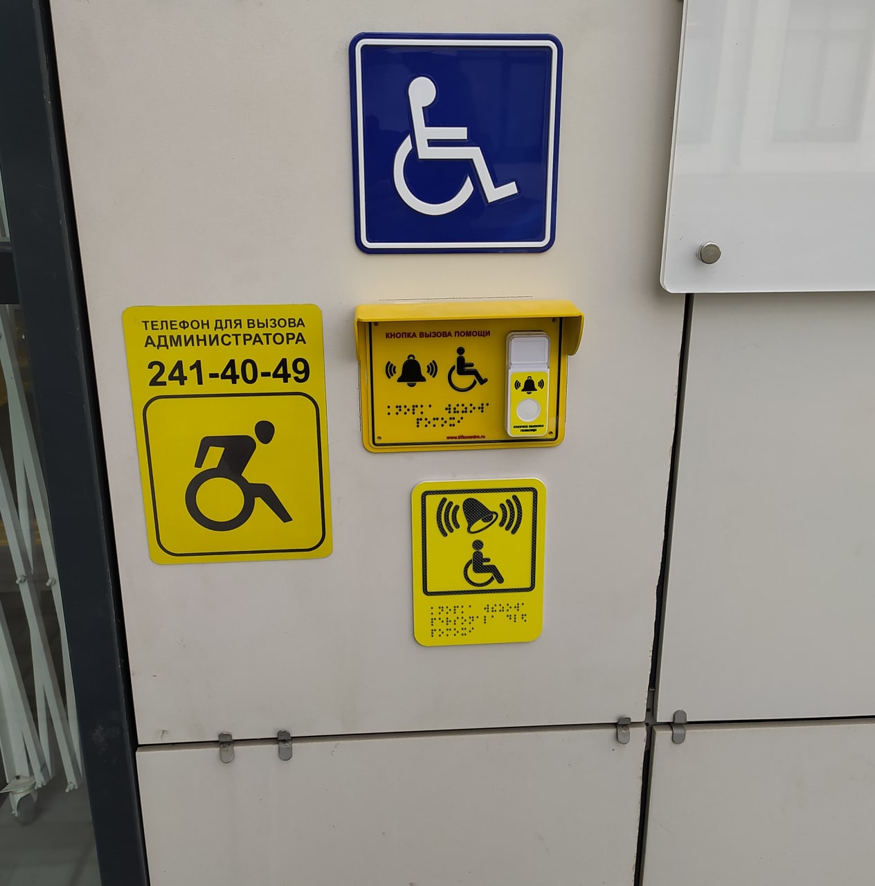 Кнопка вызова персонала для оказания помощи инвалидам всех категорий расположена на левой створке входной двери на высоте 95 см.