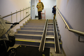 По пути движения внутри здания для слабовидящих на внутренней лестнице нанесены контрастные полосы у перепадов высот и размещена тактильная плитка.