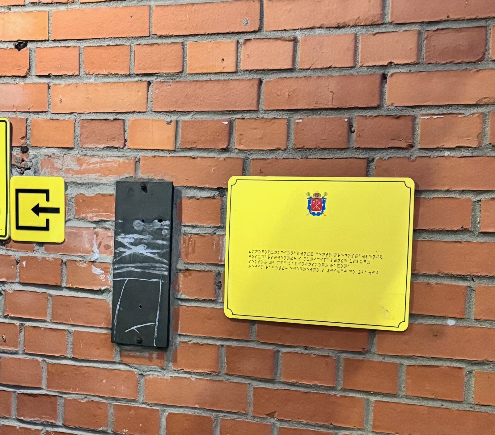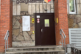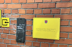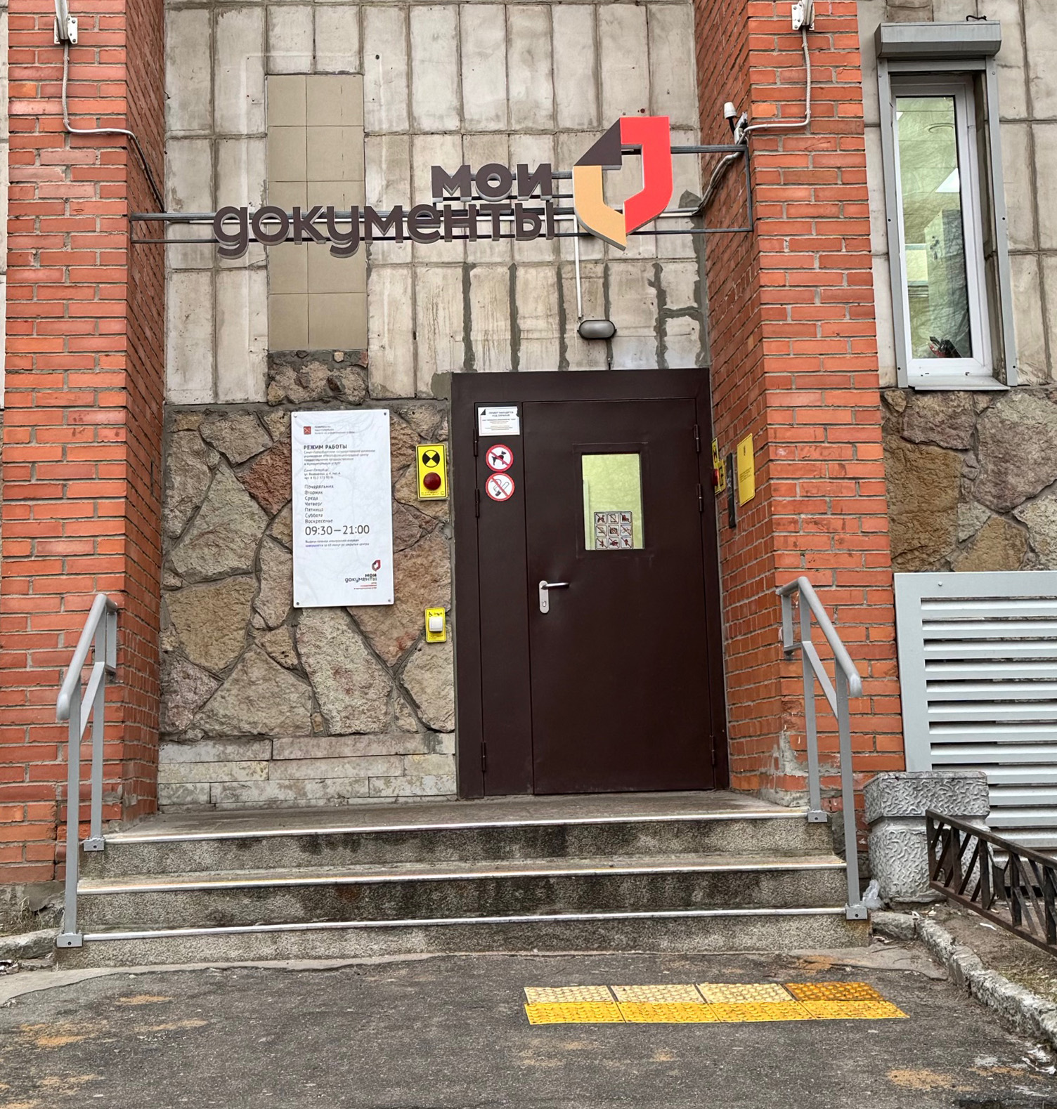 У двери входа размещена информация о режиме работы центра, выполненная шрифтом Брайля.