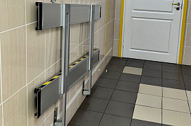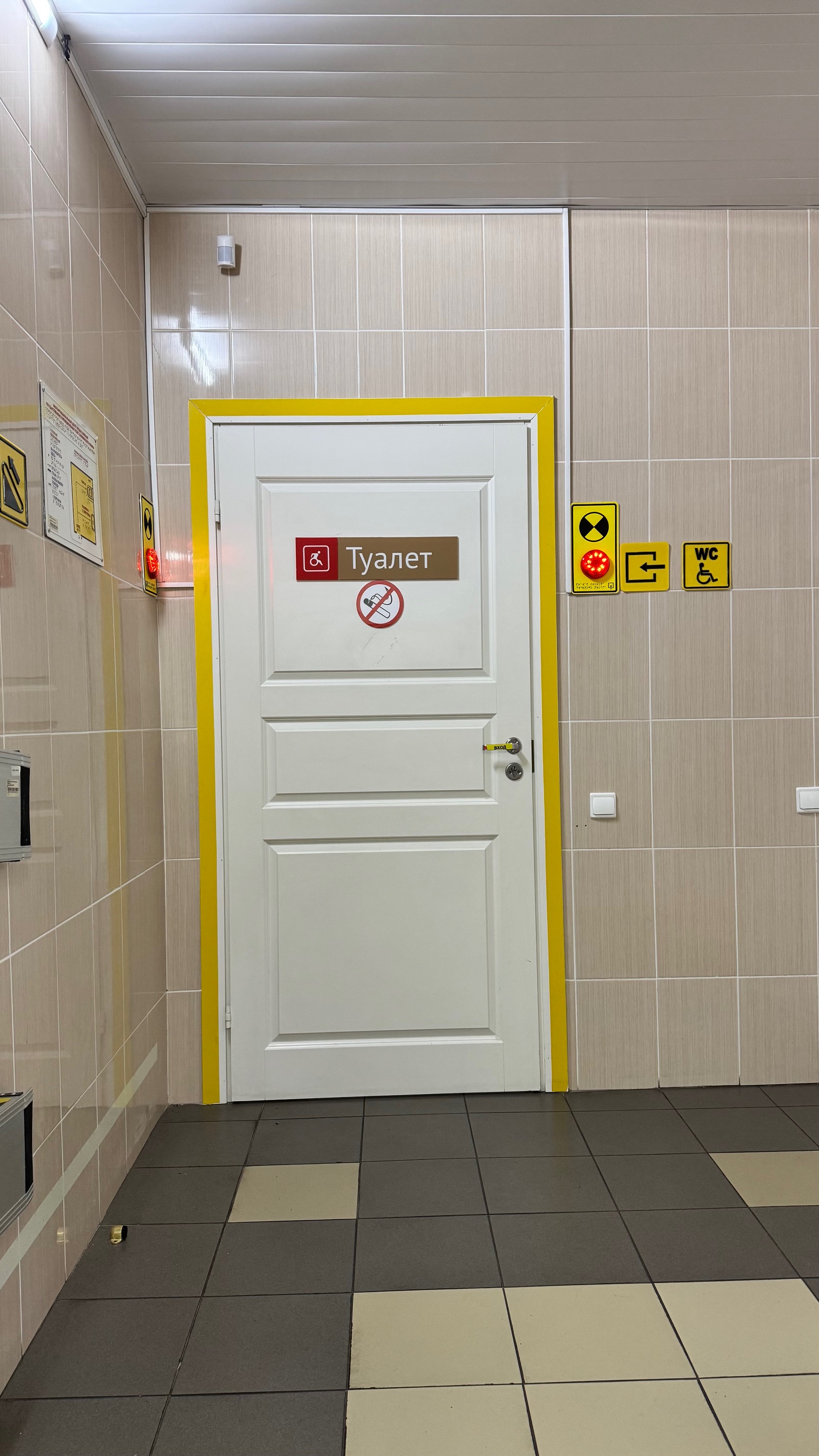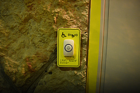 Кнопки вызова персонала для оказания помощи инвалидам всех категорий расположены с левой стороны от двери главного входа на высоте 90 сантиметров и с левой стороны от двери входа для инвалидов на высоте 90 сантиметров.