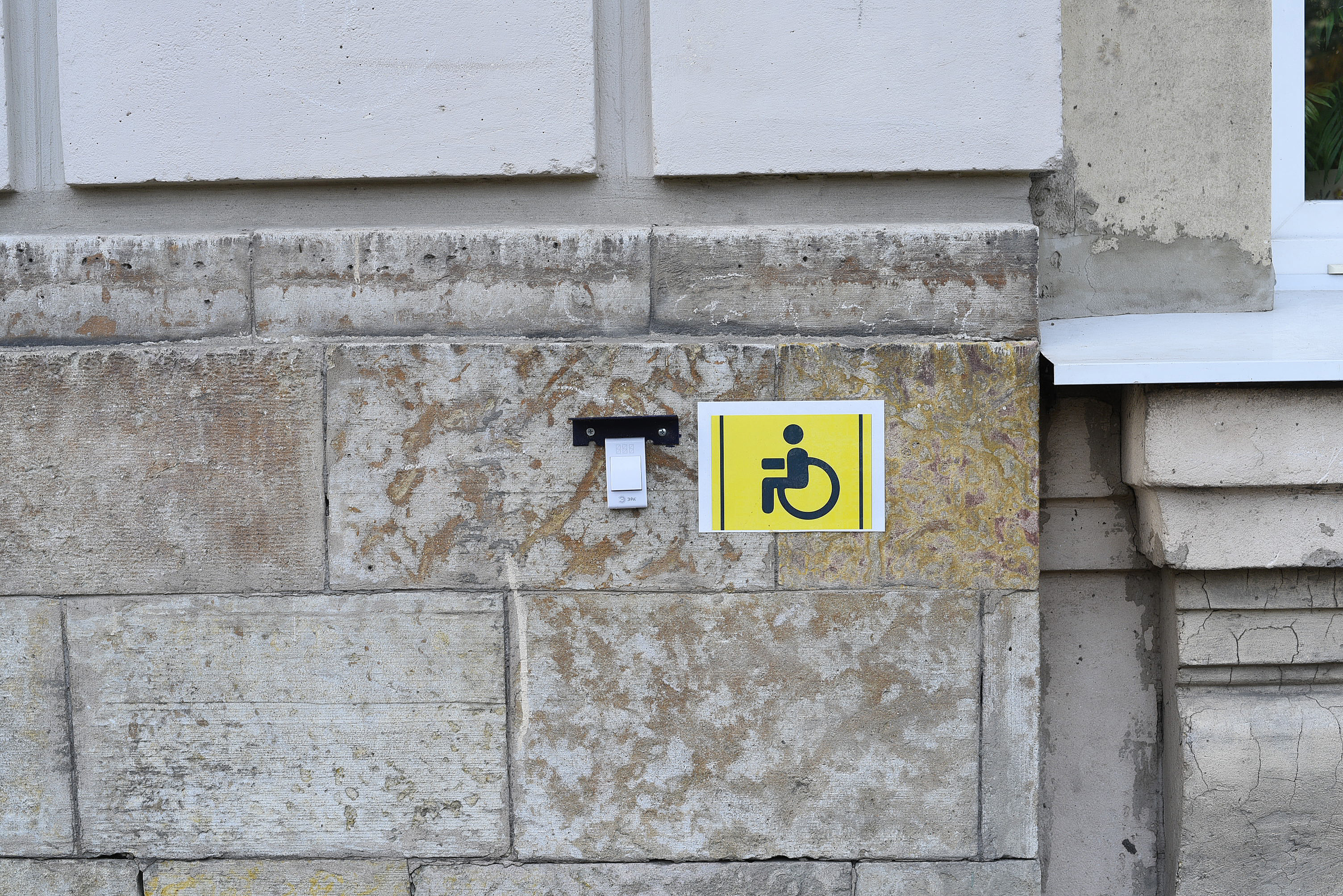 Кнопка вызова персонала для оказания помощи инвалидам всех категорий расположена с левой стороны от двери главного входа на высоте 70 сантиметров.