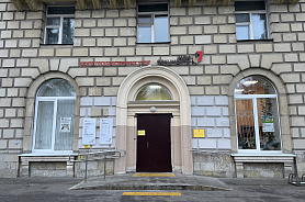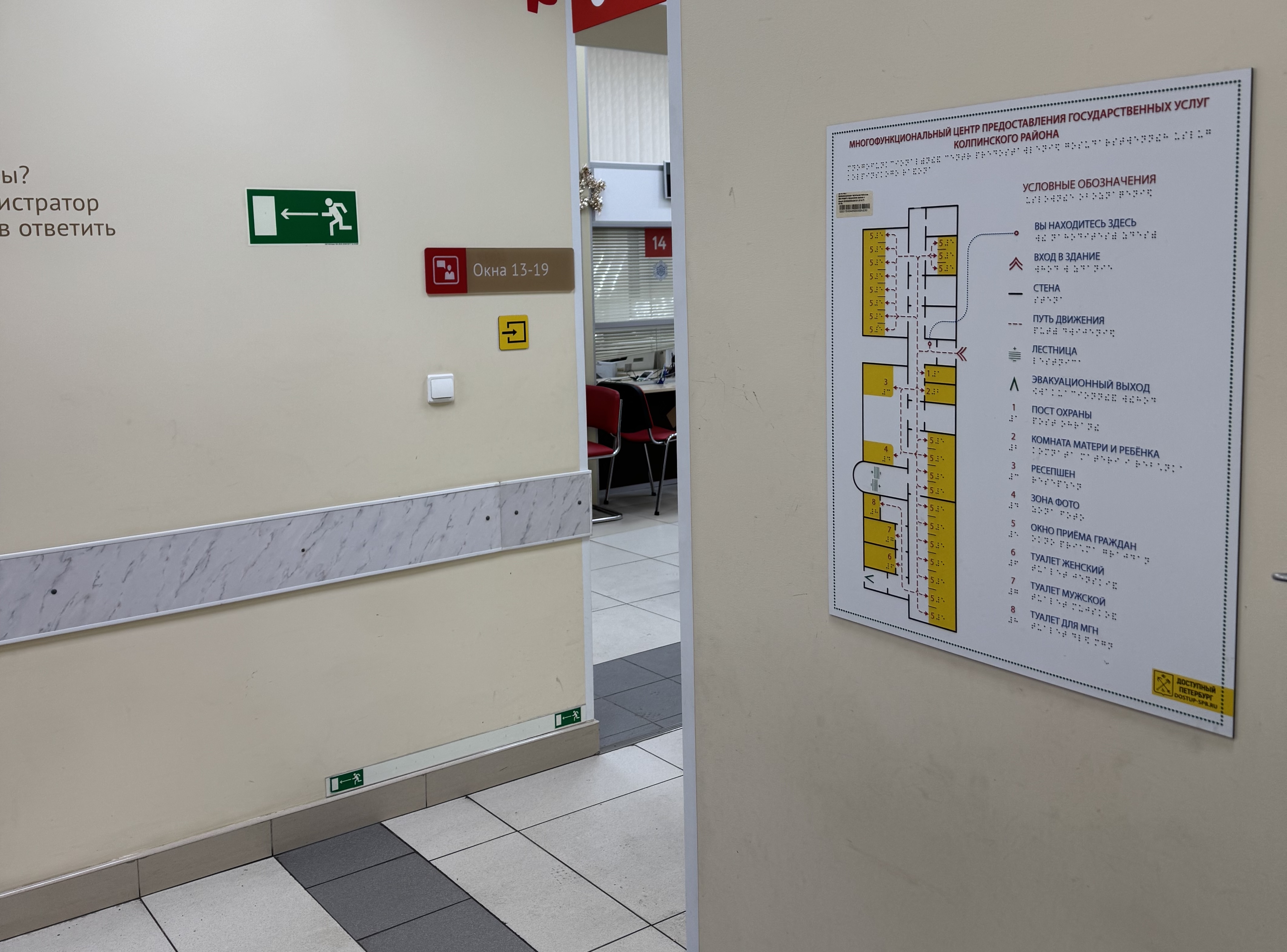 На входной двери размещена информация о режиме работы центра, выполненная шрифтом Брайля.
