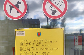 На двери входа в МФЦ размещена информация о режиме работы центра, выполненная шрифтом Брайля.