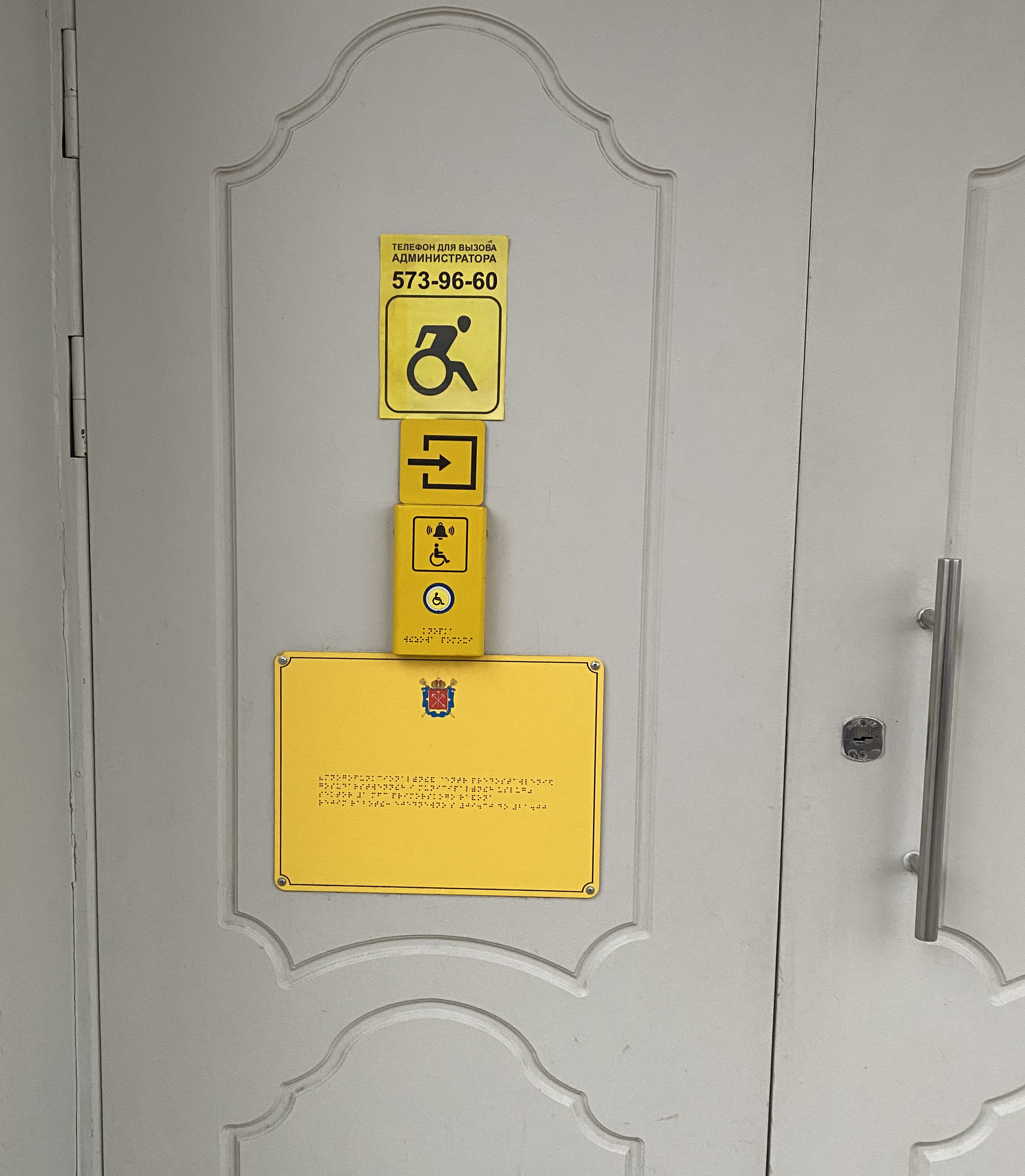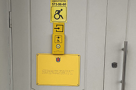 Кнопка вызова персонала для оказания помощи инвалидам всех категорий расположена с левой стороны от двери главного входа на высоте 1 метр.