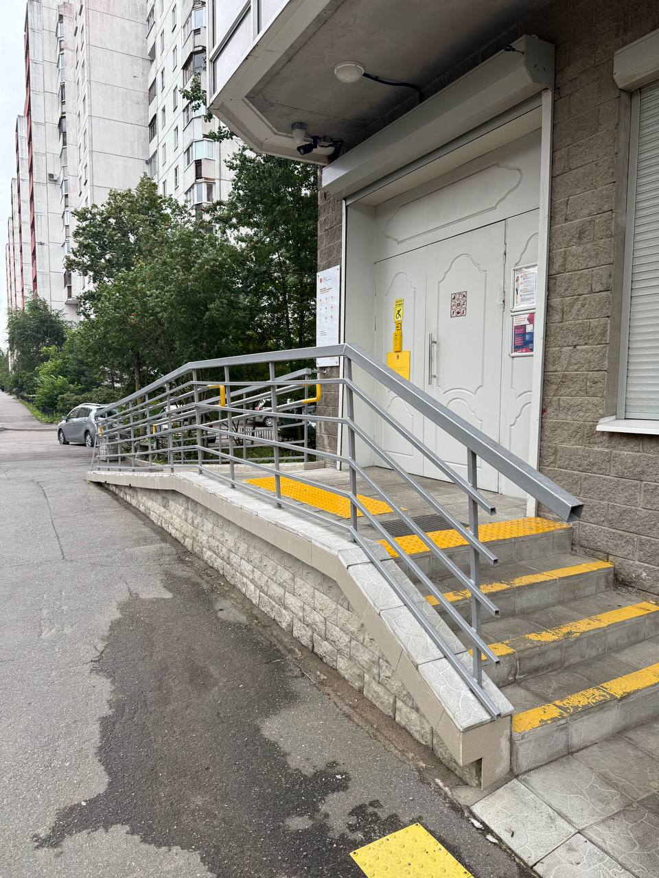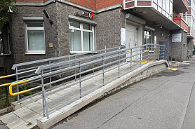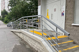 По пути движения для слабовидящих на пандусе и наружной лестнице нанесены контрастные полосы у перепадов высот.