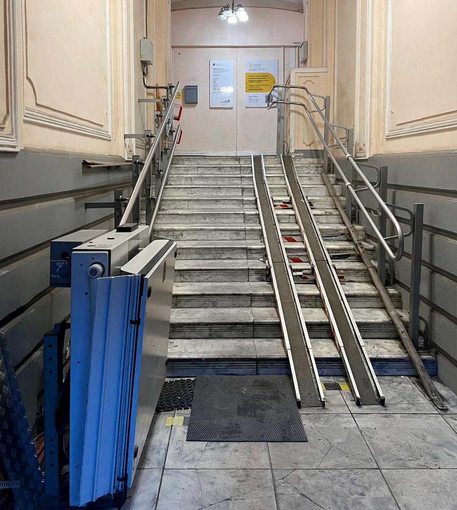 Кнопка вызова персонала для оказания помощи инвалидам всех категорий расположена с правой стороны от центрального входа на высоте 95 сантиметров.