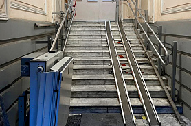 При входе в МФЦ с правой стороны располагается кнопка вызова администратора. При входе в здание одна ступень вниз, далее лестница, состоящая из 12 ступеней вверх оборудованная поручнями. Электрический подъемник расположен с левой стороны входной группы.